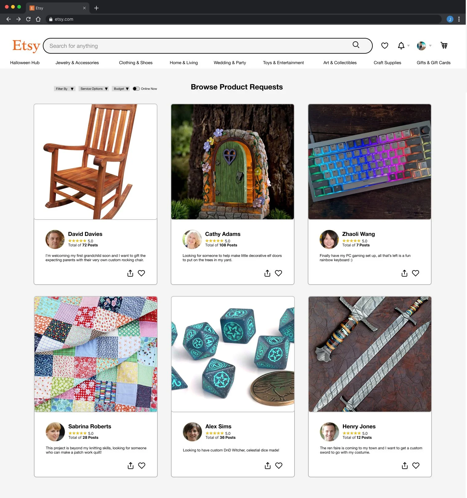 Etsy is a global e-commerce platform that allows artisans to sell their unique creative goods in their own online shop. Customers come to Etsy for products they can’t buy anywhere else, but sometimes what they want hasn’t been made yet. Therefore Etsy wants to create and expand on a feature that allows customers to post their custom made to order product requests that qualified artisans can reply to with quotes.